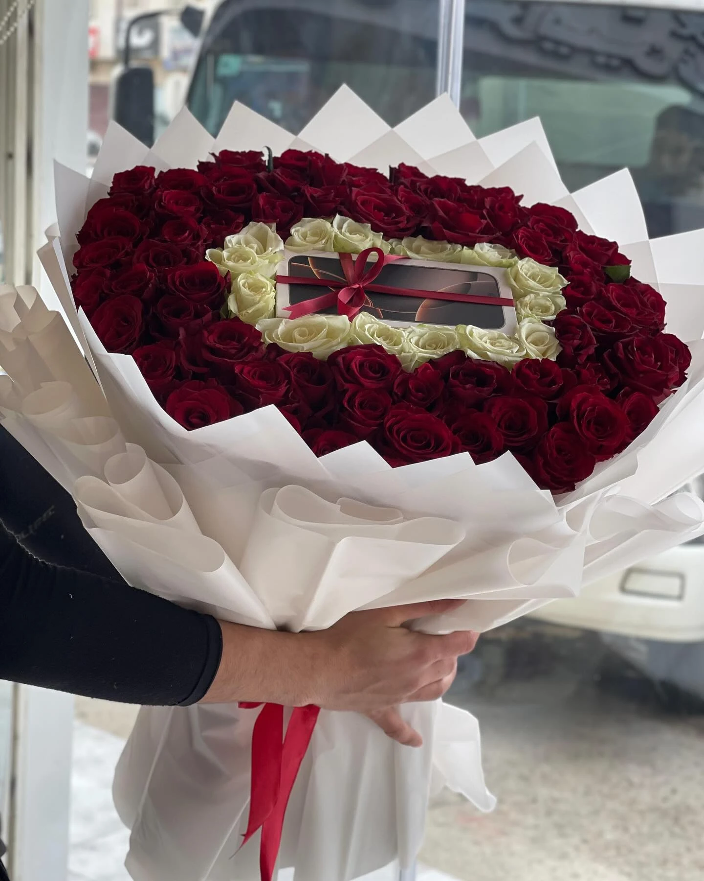 الصفحة الرئيسية المنتجات تنسيق باقة ورد وجوال ايفون 50 ورده جوري